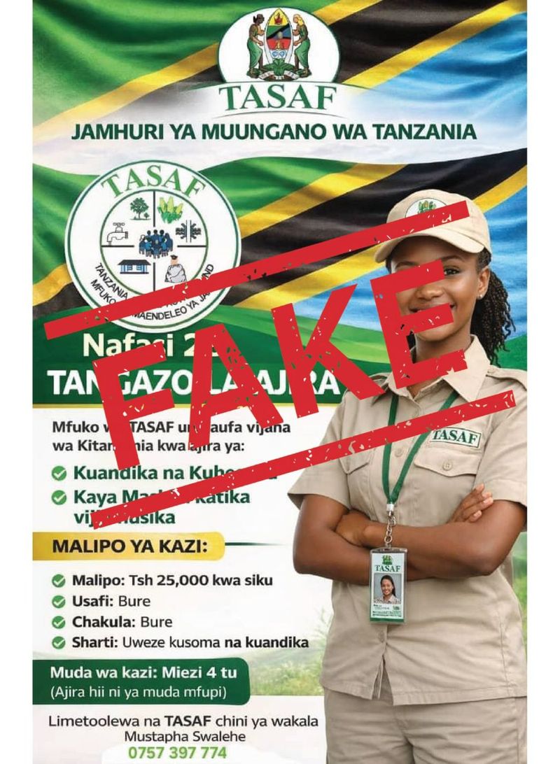 Mfuko wa Maendeleo ya Jamii (TASAF) unapenda kuutangazia umma kuwa, HAUJATOA TANGAZO LA NAFAZI HIZI ZA KAZI ZINAZOSAMBAA KWENYE BAADHI YA MITANDAO YA KIJAMII.