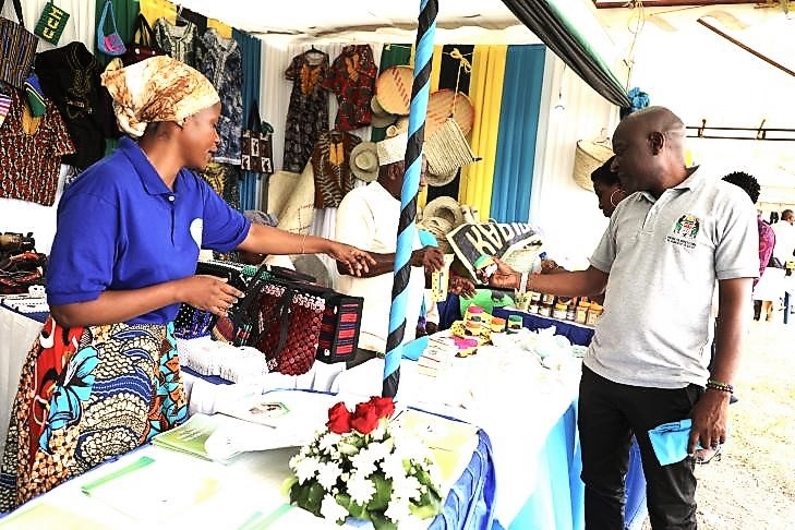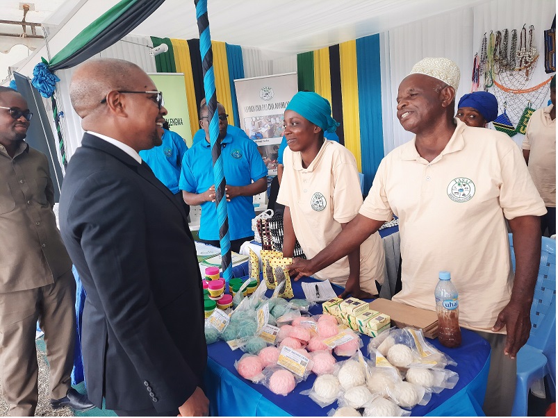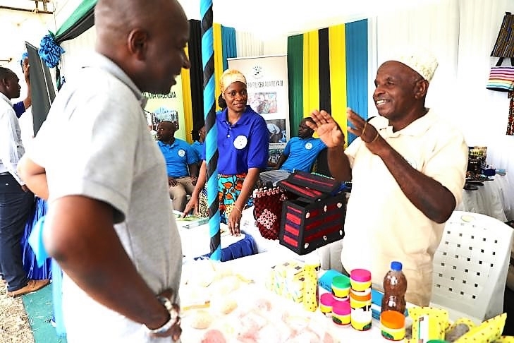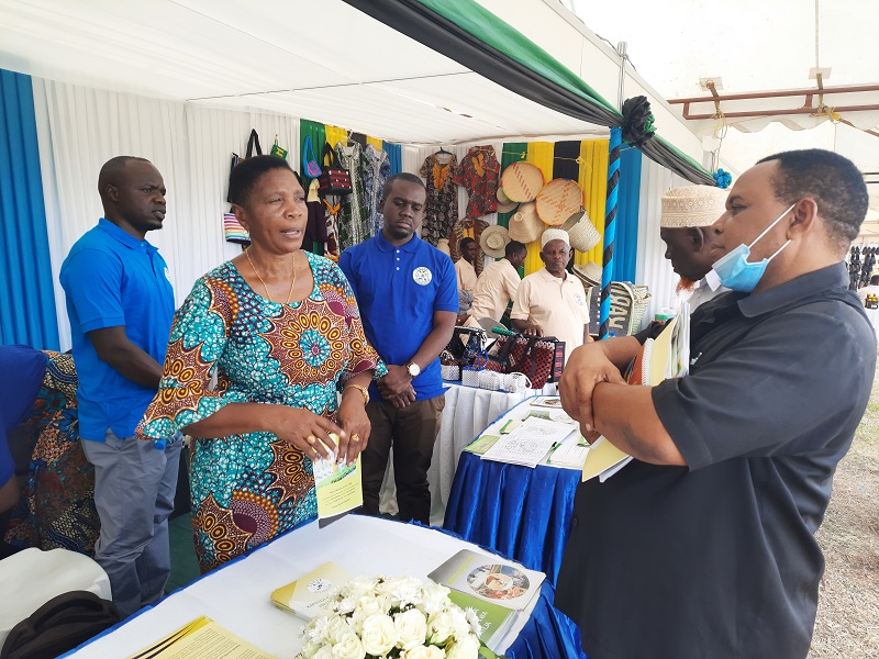 Mnufaika wa Mpango wa TASAF kutoka Mlingotini, Bagamoyo Mkoani Pwani Bwana Machano Ali Jingalao akitoa maelezo ya bidhaa zake kwa mwananchi aliyefika banda la TASAF wakati wa Maonyesho ya Wiki ya Usalama na Afya Mahala pa Kazi