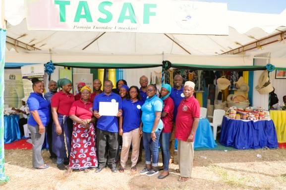 Watumishi wa Mfuko wa Maendeleo ya Jamii Tanzania, pamoja na Wanufaika wa Mpango wa Kunusuru Kaya za Walengwa wa TASAF, baada ya kupokea cheti cha Ushiriki wakati wa Maonyesho ya Wiki ya Usalama na Afya Mahala pa Kazi